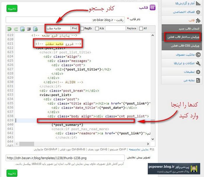 برای این کار در پنل مدیریت وبلاگ بیان و از ستون سمت راست به قسمت ویرایش ساختار قالب فعلی بروید و در کادر جستجو عبارت "خلاصه مطلب" را جستجو کنید سپس کدهای زیر را در قسمت مشخص شده در عکس زیر وارد کنید