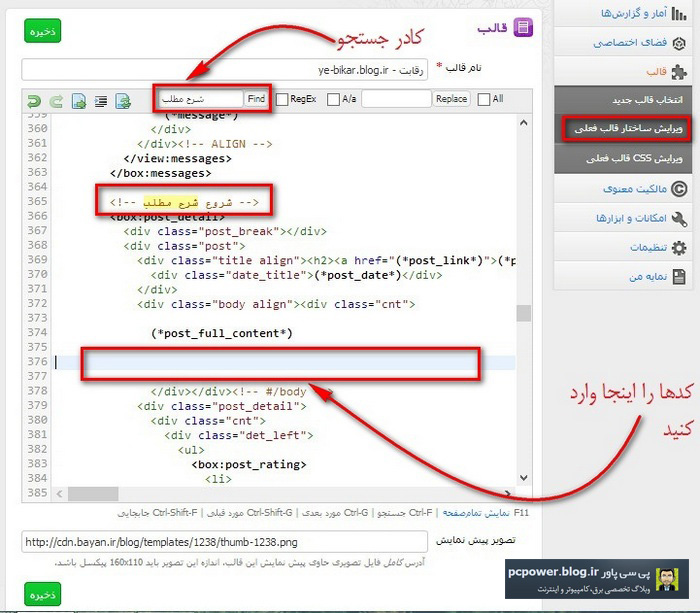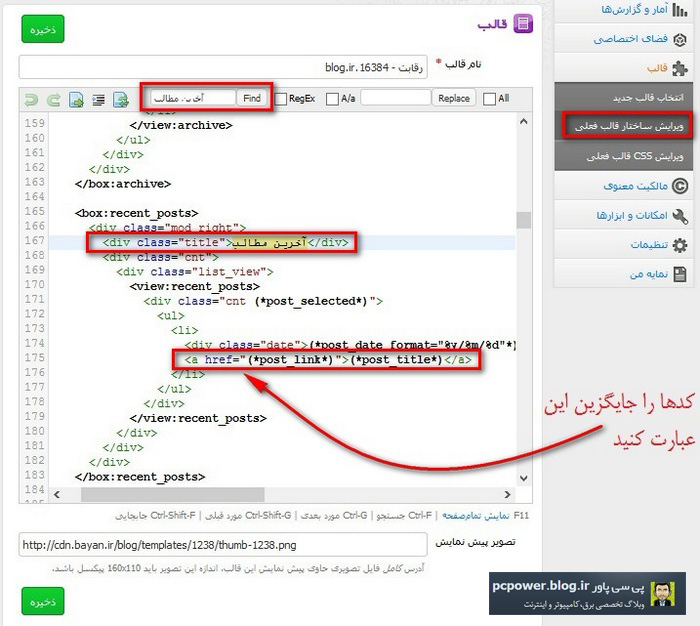در قسمت ویرایش ساختار قالب فعلی و در کادر جستجو عبارت "آخرین مطالب" را جستجو کنید سپس کدهای زیر را جایگزین کد مشخص شده در عکس زیر کنید