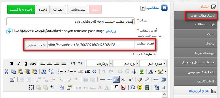 پس از این که گزینهی امکان انتخاب تصویر برای مطالب را فعال کردید در قسمت ارسال مطلب گزینهی انتخاب تصویر اضافه میشود و میتوانید برای مطالبتان تصویر انتخاب کنید