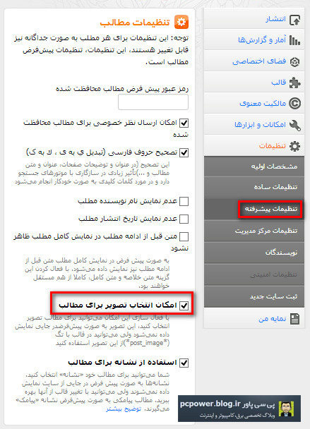 در این قسمت گزینهی امکان انتخاب تصویر برای مطالب را فعال کنید